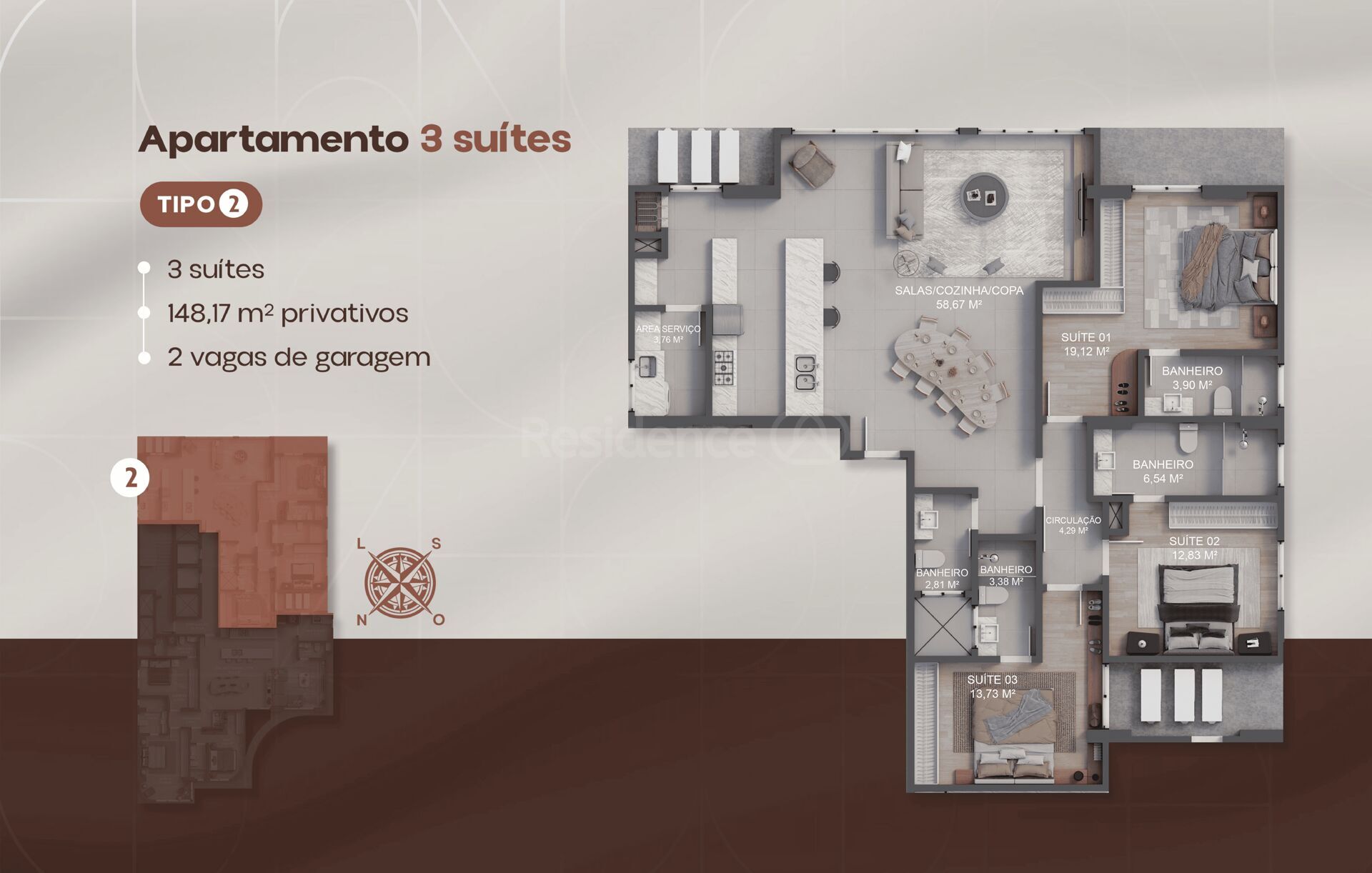 3 Dormitórios, sendo 3 suítesGaragens