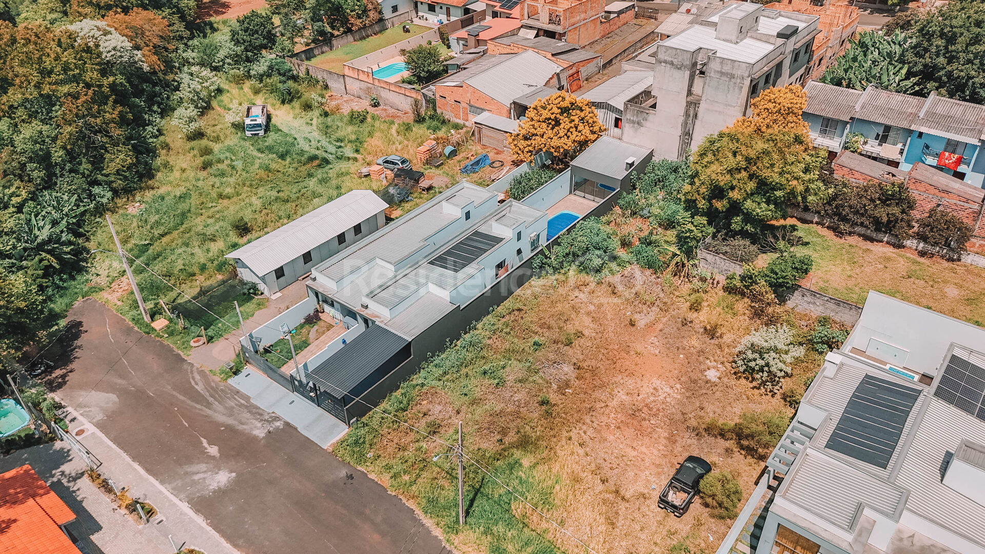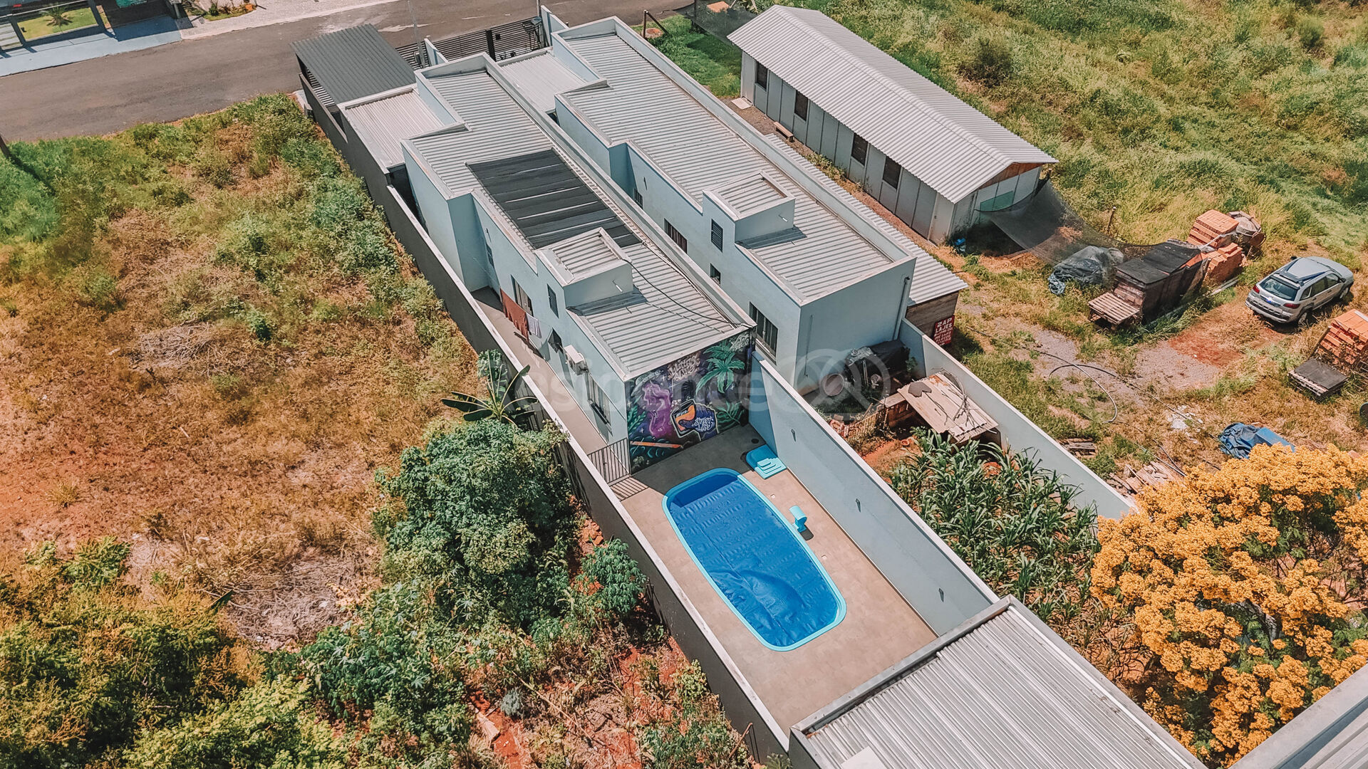 Na área externa, o imóvel dispõe de garagem coberta para dois veículos, além de edícula, churrasqueira, espaço gourmet e piscina, proporcionando um ambiente ideal para momentos de lazer e convivência.